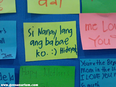 This is kind of late but I feel I just have to share this one. Well, while my friends and I strolled in a local mall this afternoon, we saw a fascinating site in the atrium. There was a wall, presumably put up yesterday, where anyone can post short messages for their beloved mothers. One side of the wall has a Facebook format while the other side appears to be like a brick pattern.
